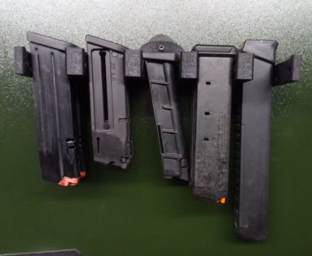 Wieszak na 10 magazynków pistoletowych (Glock, CZ w tym .22LR i wiele innych). Wieszak w zestawie z mocnym magnesem.